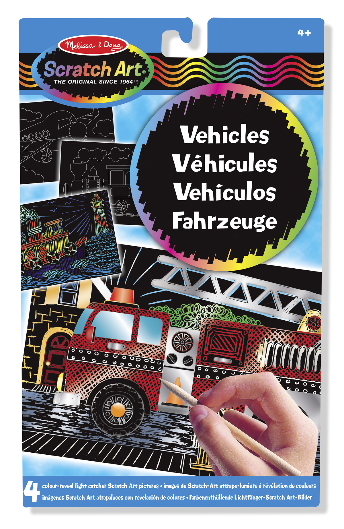 O co chodzi ze zdrapkami? Zestaw zwykle składa się z kilku czarnych kartek, drewnianego patyczka i kartonowego szablonu (choć ten ostatni element nie zawsze występuje - zależy od wybranego zestawu). Drewnianym patyczkiem zdrapujemy czarną powłokę tworząc w ten sposób obrazek. Żeby uatrakcyjnić cały proces pod czarną powłoką jest ukryte jakieś tło. Dziecko zdrapując wierzchnią warstwę nie tylko tworzy obrazek, ale i odkrywa co jest schowane pod spodem. Prosta, a jakże pomysłowa zabawka. A dzieci je wprost uwielbiają.