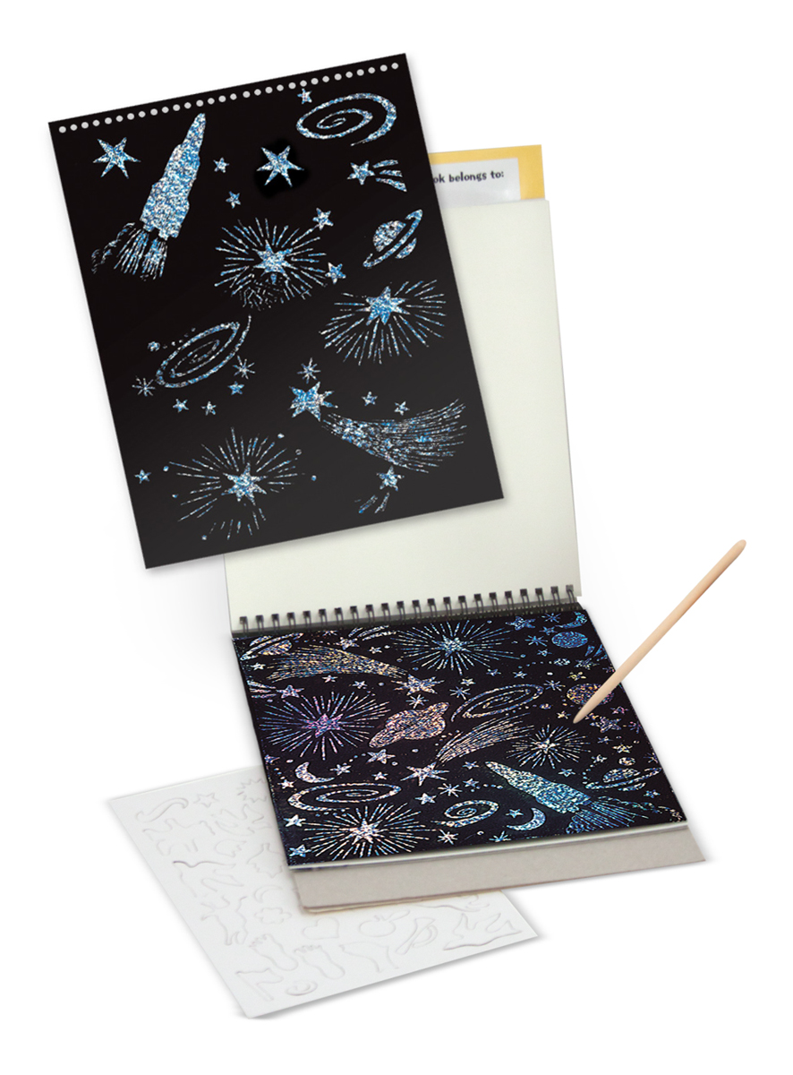 3. Zeszyt do grawerowania, który zawiera aż 12 kartek (po 6 tęczowych i 6 holograficznych) oraz szablony dla fanów zdrapek.
